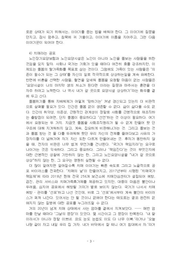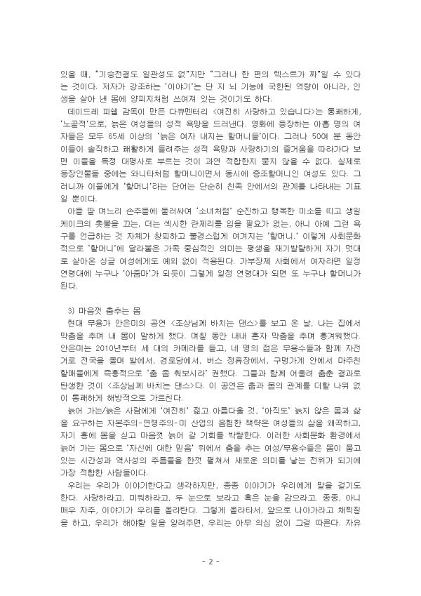 ÀÌ Ã¥(Èò¸Ó¸® ÈÖ³¯¸®¸ç, ¿¹¼ø ÀÌÈÄ Æä¹Ì´ÏÁò, ±è¿µ¿Á, ±³¾çÀÎ, 2021)Àº ÀúÀÚÀÇ Á÷Á¢ üÇè°ú ¿µÈ, ¹«¿ë °ø¿¬ µî ´Ù¾çÇÑ ÅØ½ºÆ®¸¦ ¼ÒÀç·Î »ï¾Æ ³ë³âÀÇ »îÀ» ¼ºÂûÇÏ´Â ºñÆòÀÌ´Ù. ÀÌ °úÁ¤¿¡¼ ¡®¿Ï°æ¡¯À̶ó´Â ¸»·Î´Â µå·¯³¾ ¼ö ¾ø´Â °»³â±âÀÇ ÀǹÌ, ³ë³â¿¡µµ °è¼ÓµÇ´Â »ç¶û, ¹è¿ìÀÚ³ª °¡Á·ÀÇ Á×À½À» ´ëÇϴ ŵµ, ¡®Ä¡¸Å¡¯¸¦ ´ëÇÏ´Â ½Ã°¢±îÁö ³ªÀÌ µêÀ» µÑ·¯½Ñ À̾߱Ⱑ ÆîÃÄÁø´Ù. 1) À£ÄÄ Åõ °»³â±â ´ëÁ߸Åü¿¡ º¸ÀÌ´Â ³ë³âÀº ±Ø°ú ±ØÀÌ´Ù. ¸¶´ç ÀÖ´Â Áý¿¡¼ ¿©À¯·Ó°Ô ½Ã°£À» º¸³»¸ç ¹Ì¼Ò Áþ´Â °í·ÉÀÇ ºÎºÎ, »ý¾Ö óÀ½À¸·Î µµÀüÇÏ´Â ¸ÚÁø ³ë³âÀÇ ¸ð½ÀÀº ÀºÅð ÈÄ »îÀÇ Èñ¸Á ÆíÀÌ´Ù. ¹Ý¸é ÆóÁö¸¦ ÁÖ¿ö »ý°è¸¦ À¯ÁöÇÏ´Â ³ë³â, Ä¡¸Å³ª º´¿¡ °É·Á ¿ä¾ç½Ã¼³À̳ª °íµ¶»çÇÏ´Â ³ë³âÀº ´©±¸µµ ¹Ù¶óÁö ¾Ê´Â´Ù. ±×·¯³ª ¾î¶² °èȹÀ¸·Îµµ ³ªÀÌ µê°ú Á×À½¿¡ ´ëÇÑ µÎ·Á¿ò, »çȸÀû °í¸³°¨°ú ¼Ò¿Ü°¨À» ¸·À» ¼ö´Â ¾ø´Ù. ¡®´Ä¾î°¡´Â¡¯ ¸öµéÀº ¸ö¿¡ ´ëÇÑ Æä¹Ì´ÏÁòÀÇ ÇØ¼®À» °»½ÅÇÑ´Ù. °»³â±â, Àå¾Ö, ³ë³â¿¡ ´ëÇØ Æä¹Ì´ÏÁò ¾È¿¡¼ ÀÌ·ç¾îÁ® ¿Â ÀÛ¾÷µéÀÌ ¾øÁö ¾ÊÀ½¿¡µµ ¿©ÀüÈ÷ ³ë³â¿©¼ºÀº Æä¹Ì´ÏÁò Á¤Ä¡ÀÇ ¡®ÁÖº¯ºÎ¡¯¿¡ À§Ä¡ÇÑ´Ù. ³ë³â¿©¼ºÀº ³í¹®¿¡¼º¸´Ù »çȸº¹ÁöÇÐ, ³ë³âÇÐ, °£È£ÇÐ ³í¹®¿¡¼ ÈξÀ ´õ ÀÚÁÖ µîÀåÇÑ´Ù. ÀÌÀ¯´Â ¿©·¯ °¡Áö°ÚÁö¸¸, ¹«¾ùº¸´Ù ´ÄÀ½À» ¡®³ªÀÇ °Í¡¯À¸·Î Á÷¸éÇÏÁö ¸øÇÏ´Â ¹®ÈÀû ȸÇǵµ Áß¿äÇÑ ¿äÀÎÀÏ °ÍÀÌ´Ù. °ü°ÇÀº ¡®³ªÀÇ¡¯ °»³â±â¸¦ ¡ª ±×¸®°í ¡®³ªÀÇ¡¯ ¼Õ»óÀ», ³ëȸ¦, ÅëÁõÀ», ÀÇÁ¸À», ÀÎÁöÀå¾Ö¸¦, Á×À½À» ¡ª Æä¹Ì´Ï½ºÆ® Á¤Ä¡Çп¡ ¿¬°á ÁöÀ» ¼ö Àִ°¡ÀÌ´Ù. È£¸£¸ó ¾àÀ» ¸ÔÀ¸¸é À¯¹æ¾Ï °É¸± È®·üÀÌ ³ô¾ÆÁö´Ï ¸ÔÀ»Áö ¸»Áö ½º½º·Î °áÁ¤Ç϶ó´Â ¸»À» µéÀº °Ô ºÒ°ú ½Ê¿© ³â ÀüÀε¥, ÀÇ»çµéÀº ÀÌÁ¦ ¡®È£¸£¸ó Ä¡·á´Â ¼±ÅÃÀÌ ¾Æ´Ñ Çʼö¡¯¶ó°í °è¸ùÀÇ ¸ñ¼Ò¸®¸¦ ³ôÀδÙ. Èûµé°Ô °»³â±â¸¦ º¸³½ ¿©¼ºµéÀÌ ÇѰᰰÀÌ ¸»ÇÏ´Â ¡®¼Ò¿Ü¿Í ¿Ü·Î¿ò¡¯ÀÇ °¨Á¤Àº ±×µéÀ» ÁøÁöÇÏ°Ô ´ëÇÏÁö ¾Ê´Â ÀÇ»çµé¿¡°Ô¸¸ ÇâÇÏ´Â °Ç ¾Æ´Ï´Ù. ±×°ÍÀº ¾ÆÁ÷ Çü¼ºµÇÁö ¾ÊÀº, ȤÀº Çü¼ºµÇ±â ½ÃÀÛÇßÁö¸¸ ¾ÆÁ÷ ¸Æ¶ôÀ¸·Î ÀÛ¿ëÇÏÁö ¸øÇÏ´Â °»³â±â ´ã·Ð¿¡ ´ëÇÑ ¾Æ½¬¿ò°ú °¥Áõ °°Àº °ÍÀÌ´Ù. 2) ¸ðµÎ¿¡°Ô Äè¶ôÀ» ÇãÇÏ¶ó ¡®¾ÈƼ ¿¡ÀÌ¡¡¯À̳ª ¡®À£-¿¡ÀÌ¡¡¯ °°Àº ¼¼°£ÀÇ ¸»µéÀ» ¼ø½Ä°£¿¡ °øÇãÇÏ °Ô ¸¸µå´Â ÀÌ Áú¹®°ú ¾¾¸§Çϸç, ÀúÀڴ ƯÈ÷ ¸î °³ÀÇ Àå¿¡¼ ¸ö¿¡ ´ëÇÑ ±âÁ¸ÀÇ ´ã·ÐÀ» ºñÆÇÀûÀ¸·Î »ìÆìº¸°í ¸ö°ú ½Ã°£¼º, ±×¸®°í º¯ÈÇÏ´Â ÀÚ ¾Æ¶ó´Â ¹®Á¦¿¡ ´ëÇØ Æä¹Ì´Ï½ºÆ® »çÀ¯¸¦ Àü°³ÇÑ´Ù. ¸»ÀÌ ¾È ÅëÇϹǷΠ¡®»ì¾ÆÀÖ´Ù¡¯°í ¿©°ÜÁöÁö ¾Ê´Â(¡°¾îÂ÷ÇÇ ±â¾ï ¸ø ÇϽôϱî ~ÇØµµ µÅ¿ä¡±) Ä¡ ¸Å½Ã¹ÎÀ» ´Ù½Ã »çȸÀû »îÀ¸·Î µ¹¾Æ¿À°Ô ÇÏ´Â °úÁ¤¿¡¼, Ű¿öµå´Â ¡®À̾߱⡯¿Í °ü°è¼º(°¨ÀÀ)ÀÌ´Ù. Ä¡¸Å½Ã¹ÎÀÇ ¾ð¾î ÇàÀ§¿¡¼ ¡®¼ÒÅ롯º¸´Ù´Â ¡®Ç¥Çö¡¯ À̶ó´Â Â÷¿ø¿¡ ÁÖ¸ñÇÒ ¶§, ±×¸®°í ±×°Í¿¡ ¹ÝÀÀÇϰí À̾¸ç ÇÔ²²ÇÏ´Â »ó´ë¹æÀÌ ÀÖÀ» ¶§, ¡°±â½ÂÀü°áµµ Àϰü¼ºµµ ¾ø¡±Áö¸¸ ¡°±×·¯³ª ÇÑ ÆíÀÇ ÅØ½ºÆ®°¡ Â¥¡±ÀÏ ¼ö ÀÖ´Ù´Â °ÍÀÌ´Ù. ÀúÀÚ°¡ °Á¶ÇÏ´Â ¡®À̾߱⡯´Â ´Ü Áö ³ú ±â´É¿¡ ±¹ÇÑµÈ ¿ª·®ÀÌ ¾Æ´Ï¶ó, ÀλýÀ» »ì¾Æ ³½ ¸ö¿¡ ¾çÇÇÁöó·³ ¾²¿©Á® ÀÖ´Â °ÍÀ̱⵵ ÇÏ´Ù. µ¥À̵巹 Çǽ© °¨µ¶ÀÌ ¸¸µç ´ÙÅ¥¸àÅ͸® <¿©ÀüÈ÷ »ç¶ûÇϰí ÀÖ½À´Ï´Ù>´Â ÅëÄèÇϰÔ, ¡®³ë°ñÀû¡¯À¸·Î, ´ÄÀº ¿©¼ºµéÀÇ ¼ºÀû ¿å¸ÁÀ» µå·¯³½´Ù. ¿µÈ¿¡ µîÀåÇÏ´Â ¾ÆÈ© ¸íÀÇ ¿©ÀÚµéÀº ¸ðµÎ 65¼¼ ÀÌ»óÀÇ ¡®´ÄÀº ¿©ÀÚ ³»Áö´Â ÇҸӴϵ顯ÀÌ´Ù. ±×·¯³ª 50¿© ºÐ µ¿¾È À̵éÀÌ ¼ÖÁ÷Çϰí ÄèȰÇÏ°Ô µé·ÁÁÖ´Â ¼ºÀû ¿å¸Á°ú »ç¶ûÇϱâÀÇ Áñ°Å¿òÀ» µû¶ó°¡´Ù º¸¸é À̵éÀ» ƯÁ¤ ´ë¸í»ç·Î ºÎ¸£´Â °ÍÀÌ °ú¿¬ ÀûÇÕÇÑÁö ¹¯Áö ¾ÊÀ» ¼ö ¾ø´Ù. ½ÇÁ¦·Î µîÀåÀι°µé Áß¿¡´Â ¿Í´ÏŸó·³ ÇÒ¸Ó´ÏÀÌ¸é¼ µ¿½Ã¿¡ ÁõÁ¶ÇÒ¸Ó´ÏÀÎ ¿©¼ºµµ ÀÖ´Ù. ±×·¯´Ï±î À̵鿡°Ô ¡®ÇÒ¸Ó´Ï¡¯¶ó´Â ´Ü¾î´Â ´Ü¼øÈ÷ Ä£Á· ¾È¿¡¼ÀÇ °ü°è¸¦ ³ªÅ¸³»´Â ±âÇ¥ÀÏ »ÓÀÌ´Ù. ¾Æµé µþ ¸ç´À¸® ¼ÕÁֵ鿡 µÑ·¯½Î¿© ¡®¼Ò³à󷳡¯ ¼øÁøÇϰí ÇູÇÑ ¹Ì¼Ò¸¦ ¶ì°í »ýÀÏ ÄÉÀÌÅ©ÀÇ ÃкÒÀ» ²ô´Â, ´õ´Â ¼½½ÃÇÑ ¶õÁ¦¸®¸¦ ÀÔÀ» Çʿ䰡 ¾ø´Â, ¾Æ´Ï ¾Æ¿¹ ±×·± ¿å±¸¸¦ ¾ð±ÞÇÏ´Â °Í ÀÚü°¡ âÇÇÇÏ°í ºÒ°æ½º·´°Ô ¿©°ÜÁö´Â ¡®ÇÒ¸Ó´Ï.¡¯ ÀÌ·¸°Ô »çȸ¹®ÈÀûÀ¸·Î ¡®ÇÒ¸Ó´Ï¡¯¿¡ ´Þ¶óºÙÀº °¡Á· Áß½ÉÀûÀÎ Àǹ̴ Æò»ýÀ» Àç±â¹ß¶öÇÏ°Ô Àڱ⠸ڴë·Î »ì¾Æ¿Â ½Ì